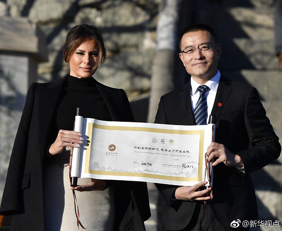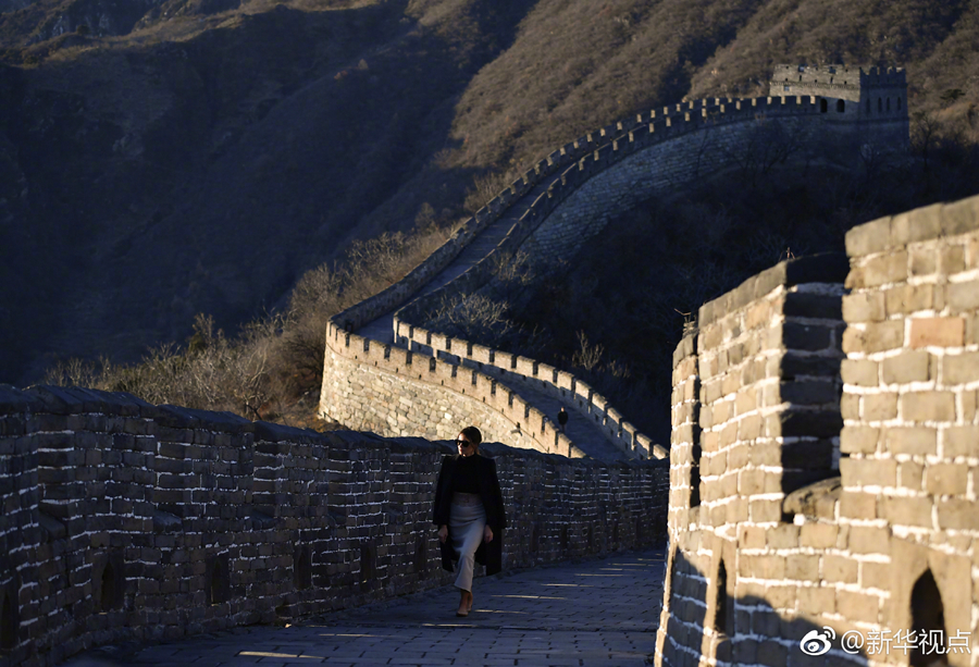 新華網(wǎng)北京11月10日電 11月10日下午,美國總統(tǒng)特朗普夫人梅拉尼婭登上慕田峪長城,獲贈“好漢證書”。北風(fēng)雖然凜冽,但蜿蜒的長城氣勢磅礴,引得梅拉尼婭流連忘返。(記者朱超、燕雁 據(jù)新華社“新華視點(diǎn)”微博報道)?????