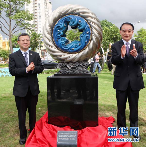 11月9日,在越南峴港APEC公園,中國外交部副部長李保東(右)、商務(wù)部副部長王受文(左)共同為中國贈送的雕塑作品《和夢同圓》揭幕。作為2017年亞太經(jīng)合組織(APEC)領(lǐng)導人會議周的一部分,越南峴港APEC公園9日正式開放,展示21個成員經(jīng)濟體藝術(shù)家創(chuàng)作的雕塑。新華社記者李鵬攝