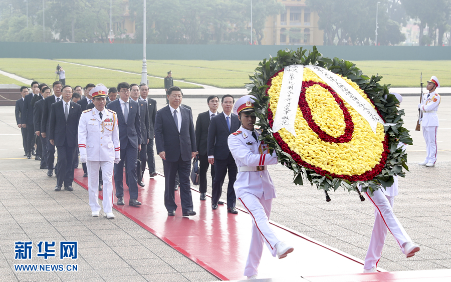 同日,習(xí)近平瞻仰胡志明主席陵并敬獻(xiàn)花圈。