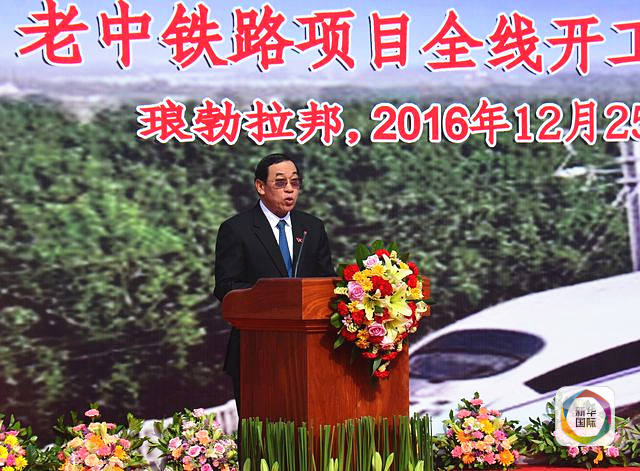 2016年12月25日,老中鐵路項目全線開工儀式在老撾瑯勃拉邦舉行,老撾公共工程與運輸部部長奔占·辛塔馮在開工儀式上致辭。(新華社發(fā))