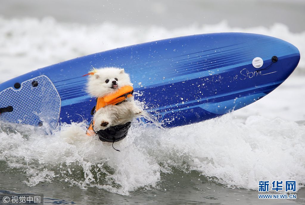 當(dāng)?shù)貢r(shí)間2015年8月1日,美國(guó)加利福尼亞州因皮里爾灘舉辦第十屆狗狗沖浪比賽,可愛(ài)“汪星人”海浪中展開(kāi)激烈角逐。(圖片來(lái)源:視覺(jué)中國(guó))