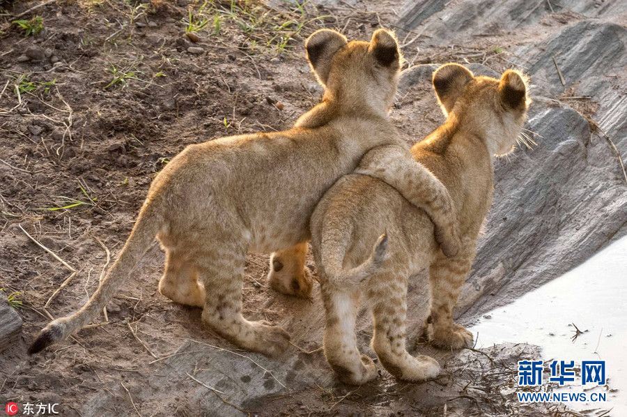 1月2日?qǐng)?bào)道(具體拍攝時(shí)間不詳),肯尼亞馬賽馬拉國(guó)家保護(hù)區(qū),64歲的攝影師Ingo Gelach在當(dāng)?shù)嘏臄z到一組有趣又暖心的照片。畫面中,兩頭小獅子站在水邊,似乎正考慮跨越面前的水域。其中一頭獅子用前腳搭在同伴的肩膀上,似乎在表達(dá)友好,又似是在鼓勵(lì)同伴不要害怕,勇敢地跨過(guò)去。(圖片來(lái)源:東方IC)