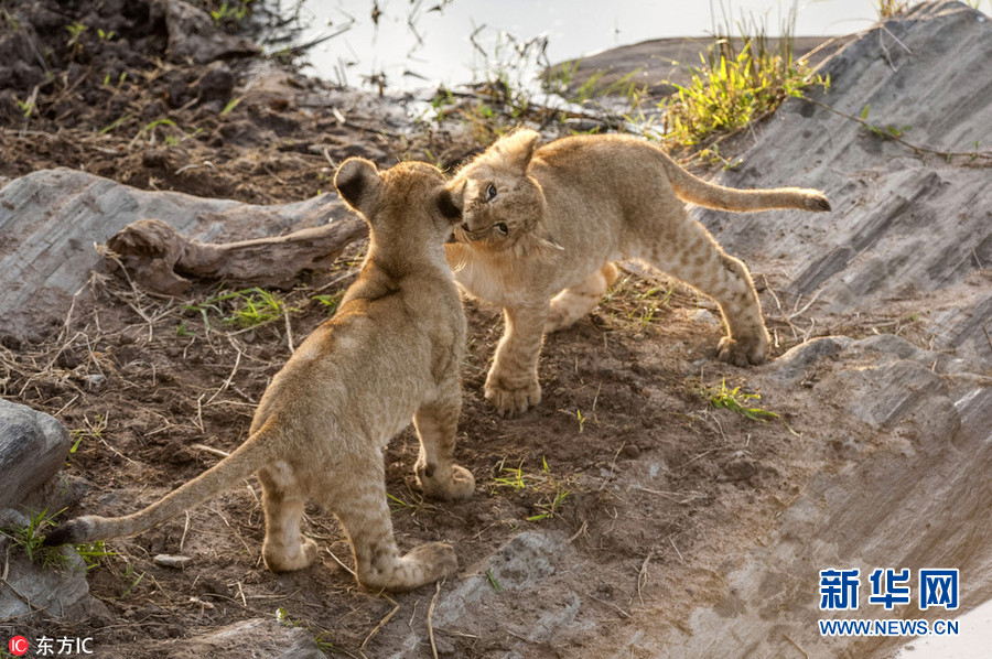 1月2日?qǐng)?bào)道(具體拍攝時(shí)間不詳),肯尼亞馬賽馬拉國(guó)家保護(hù)區(qū),64歲的攝影師Ingo Gelach在當(dāng)?shù)嘏臄z到一組有趣又暖心的照片。畫面中,兩頭小獅子站在水邊,似乎正考慮跨越面前的水域。其中一頭獅子用前腳搭在同伴的肩膀上,似乎在表達(dá)友好,又似是在鼓勵(lì)同伴不要害怕,勇敢地跨過(guò)去。(圖片來(lái)源:東方IC)