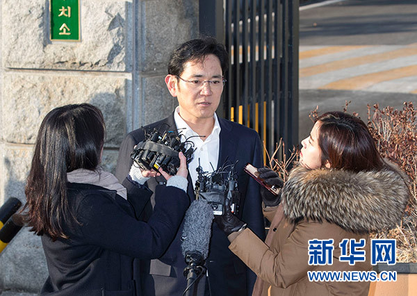 2月5日,韓國(guó)三星電子副會(huì)長(zhǎng)李在镕(中)在位于韓國(guó)儀旺市的拘留所外接受記者采訪(fǎng)。新華社發(fā)(李相浩 攝)