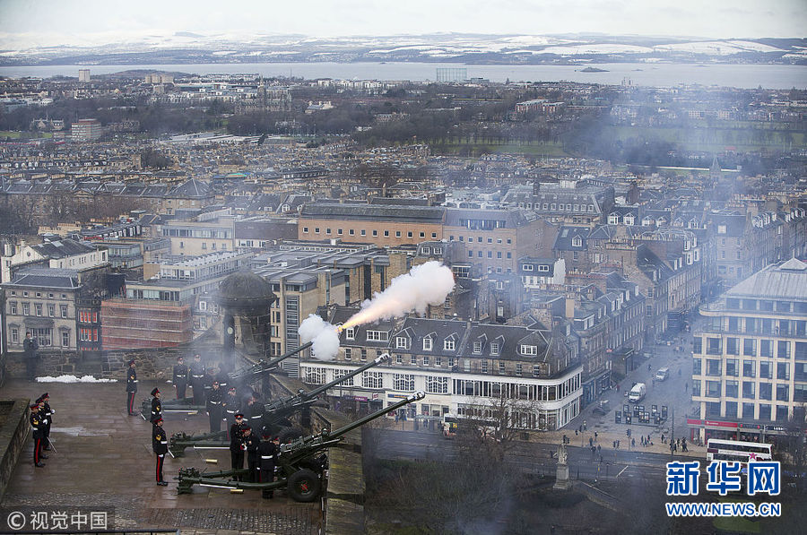 英國皇家炮兵在愛丁堡城堡鳴響21響禮炮 紀(jì)念女王登基66周年