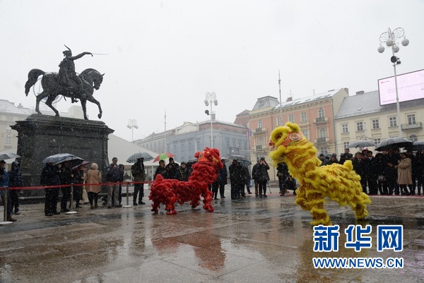 當?shù)貢r間12日中午,來自斯洛伐克中國武術(shù)協(xié)會的舞獅表演隊冒雪表演傳統(tǒng)舞獅節(jié)目,中國駐克羅地亞大使胡兆明和薩格勒布市長米蘭·班迪奇為舞獅點睛,熱鬧的鑼鼓和一紅一黃兩頭“獅子”吸引了大批市民駐足觀看。