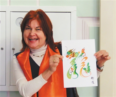 2月14日,莫斯科中國(guó)文化中心在中共六大會(huì)址常設(shè)展覽館舉辦了2018年新春聯(lián)誼會(huì)。圖為一位嘉賓展示中國(guó)民間藝人創(chuàng)作的龍形字畫。記者 張曉東攝