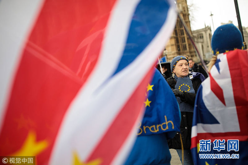 2月26日,英國(guó)倫敦,示威者在議會(huì)大廈外抗議“脫歐”。(圖片來(lái)源:視覺(jué)中國(guó))