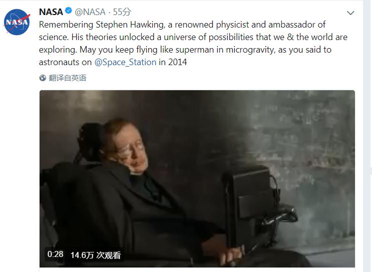 美國(guó)國(guó)家航空航天局(NASA)14日在推特上發(fā)文稱(chēng),霍金的理論為我們的探索開(kāi)啟了一系列可能。愿你像超人一樣飛行于微重力中。