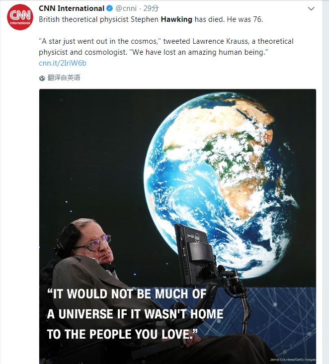 美國(guó)有線(xiàn)電視新聞網(wǎng)(CNN)引用理論物理學(xué)家、宇宙學(xué)家Lawrence Krauss的推特說(shuō):“一顆星剛剛在宇宙中熄滅,我們失去了一位了不起的人”。