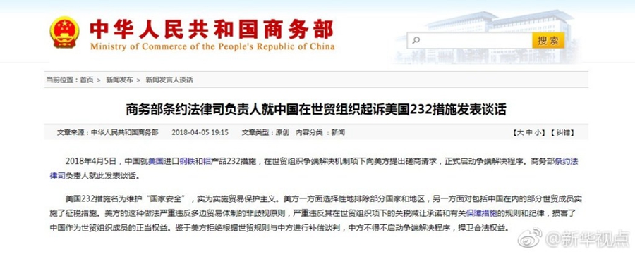 2018年4月5日,中國就美國進口鋼鐵和鋁產(chǎn)品232措施,在世貿(mào)組織爭端解決機制項下向美方提出磋商請求,正式啟動爭端解決程序。商務(wù)部條約法律司負責(zé)人就此發(fā)表談話。
