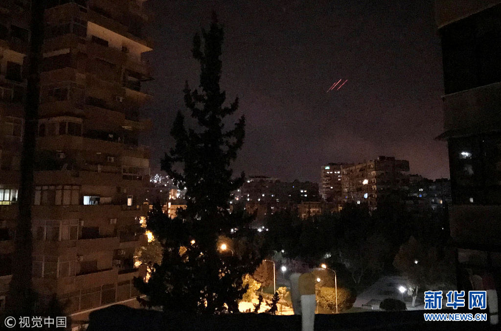 4月14日,敘利亞大馬士革,特朗普決定聯(lián)合英國(guó)和法國(guó)對(duì)敘利亞進(jìn)行精確打擊,大馬士革傳出爆炸聲,敘利亞方面進(jìn)行反擊。敘利亞阿拉伯?dāng)⒗麃喭ㄓ嵣?SANA)報(bào)道,敘政府軍在大馬士革以南地區(qū)擊落13枚導(dǎo)彈。敘利亞國(guó)家電視臺(tái)此前稱美英法三國(guó)對(duì)敘利亞“發(fā)動(dòng)了侵略”。(圖片來(lái)源:視覺(jué)中國(guó))