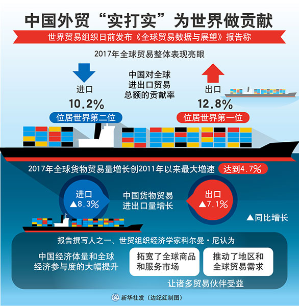 在世界經(jīng)濟(jì)遭遇保護(hù)主義、孤立主義挑戰(zhàn)的當(dāng)下,中國(guó)不但是促進(jìn)全球自由貿(mào)易、推動(dòng)建設(shè)開放型世界經(jīng)濟(jì)的積極倡導(dǎo)者,更為此做出“實(shí)打?qū)崱必暙I(xiàn)。世貿(mào)組織的數(shù)據(jù)頗具說服力:2017年全球貨物貿(mào)易量增長(zhǎng)創(chuàng)2011年以來最大增速,達(dá)到4.7%,其中,中國(guó)貨物貿(mào)易進(jìn)出口量分別增長(zhǎng)8.3%和7.1%,大大超過全球貿(mào)易增速。如果以對(duì)全球進(jìn)出口貿(mào)易總額的貢獻(xiàn)率來衡量,中國(guó)份額分別達(dá)到10.2%和12.8%。報(bào)告撰寫人之一、世貿(mào)組織經(jīng)濟(jì)學(xué)家科爾曼·尼認(rèn)為,中國(guó)經(jīng)濟(jì)體量和全球經(jīng)濟(jì)參與度的大幅提升,拓寬了全球商品和服務(wù)市場(chǎng),推動(dòng)了地區(qū)和全球貿(mào)易需求,讓諸多貿(mào)易伙伴受益。