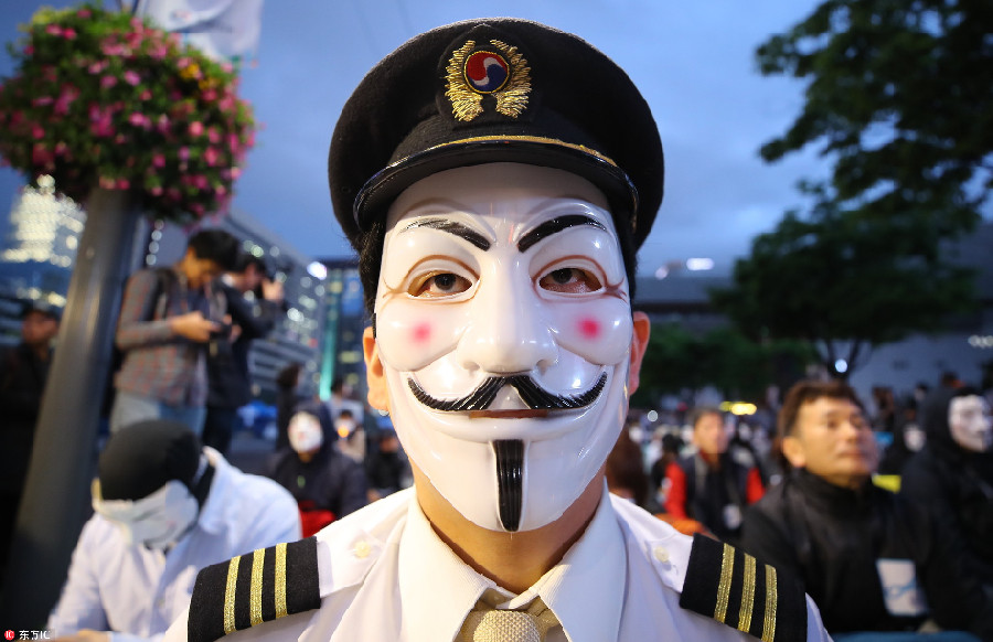 當(dāng)?shù)貢r間2018年5月18日,韓國首爾,大韓航空有限公司的飛行員戴著蓋伊·福克斯面具,在首爾市區(qū)集會抗議,反對大韓航空會長兼首席執(zhí)行官趙亮鎬及其家庭。