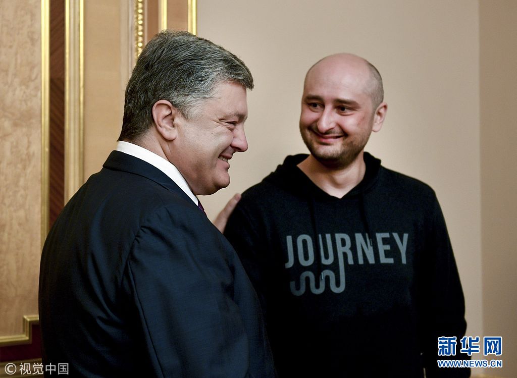 5月30日,烏克蘭基輔,烏克蘭總統(tǒng)波羅申科會(huì)見此前被報(bào)道“死亡”的俄羅斯記者巴布琴科。(圖片來源:視覺中國(guó))