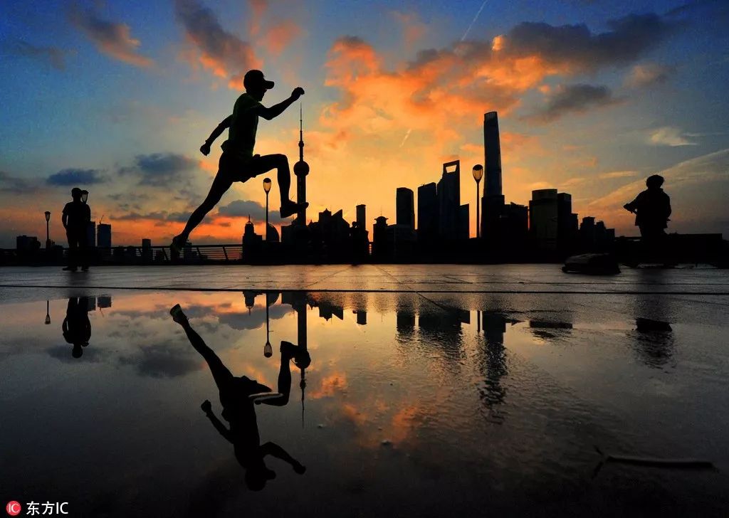 隨著暫短的陣雨飄過,外灘天空飄過美麗的紅云,一位市民正在跑步。