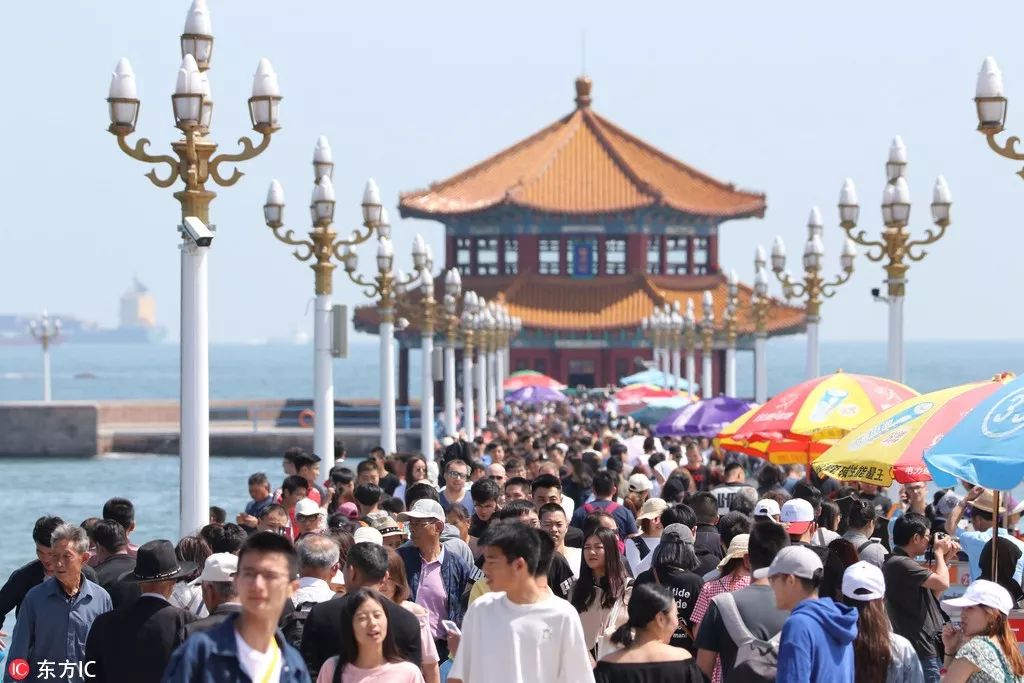游人在中國青島棧橋風景區(qū)游玩。