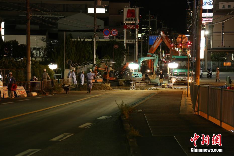 6月18日,日本大阪府發(fā)生6.1級地震。圖為位于震源附近的高槻市一處路面出現(xiàn)凹陷,相關(guān)部門正連夜進行搶修。中新社記者 呂少威 攝