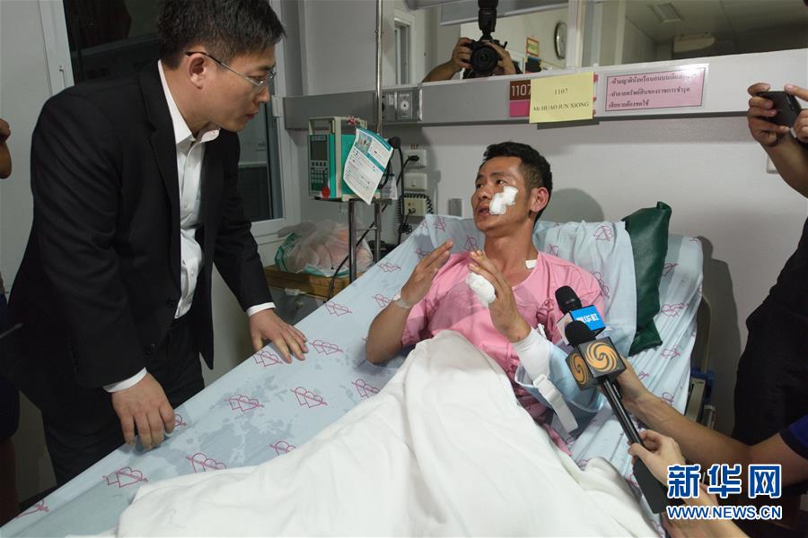 月7日,在泰國普吉,中國駐泰國大使呂?。ㄖ校┪繂柺軅袊慰?。中國政府聯(lián)合工作組7日前往普吉行政醫(yī)院,看望在5日普吉游船傾覆事故中受傷的中國同胞及家屬。2018-07-07 15:25:16