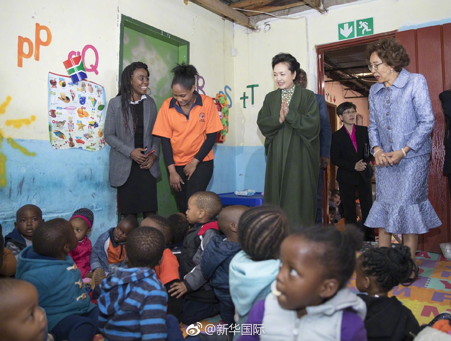 當(dāng)?shù)貢r(shí)間7月24日上午,國家主席習(xí)近平夫人、聯(lián)合國教科文組織促進(jìn)女童和婦女教育特使彭麗媛在南非總統(tǒng)夫人莫采佩陪同下,參觀位于比勒陀利亞東郊的烏坦多社區(qū)托兒所。 新華社記者 王曄 攝