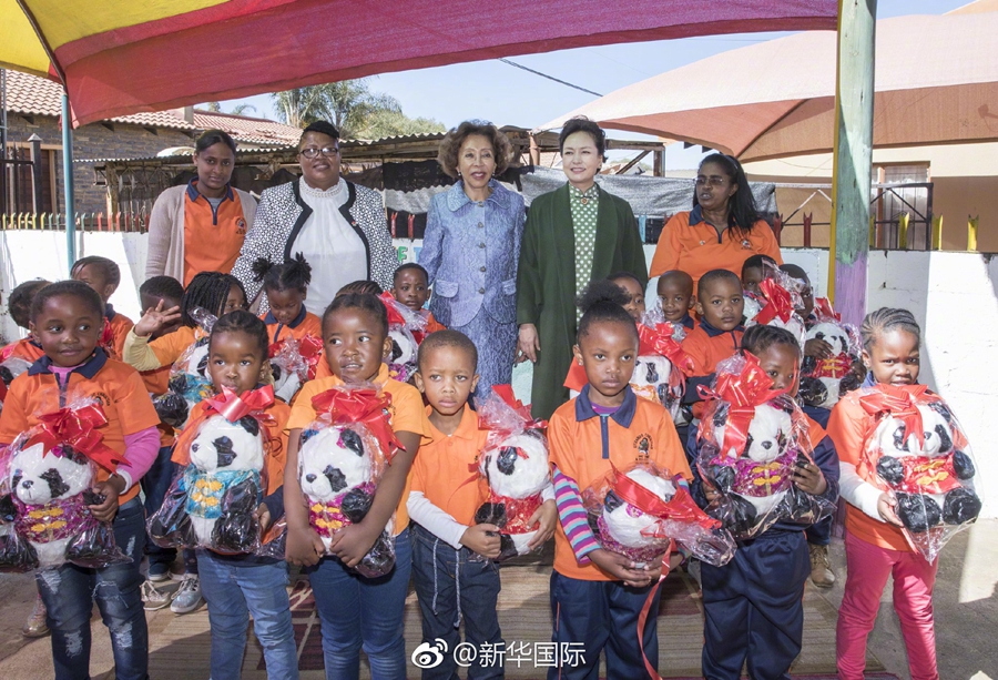 彭麗媛和莫采佩抵達(dá)時(shí),非洲自助基金會(huì)負(fù)責(zé)人、托兒所園長等在門口迎接。40名活潑可愛的南非兒童揮舞中南兩國國旗列隊(duì)歡迎,彭麗媛俯身同孩子們親切握手問候。彭麗媛來到庭院,20多名兒童手持兩國國旗,輪流用中英文高聲呼喊“歡迎歡迎”。孩子們伴著俏皮輕快的舞蹈動(dòng)作,合唱英文歌曲《歡迎您》、用中文吟唱中國古詩兒歌《詠鵝》、演唱南非說唱歌曲。彭麗媛認(rèn)真聆聽,頻頻點(diǎn)頭微笑、不時(shí)鼓掌稱贊,夸獎(jiǎng)孩子們中文發(fā)音準(zhǔn)確。彭麗媛來到教室,觀看兒童繪畫、識(shí)字,和孩子們用當(dāng)?shù)貍鹘y(tǒng)手語互致問候。彭麗媛向孩子們贈(zèng)送玩具、文具、圖書,并在孩子們自己創(chuàng)作的手印畫上題寫“前程似錦”,勉勵(lì)孩子們好好學(xué)習(xí)、茁壯成長。彭麗媛表示,兒童成長關(guān)乎一個(gè)國家未來。兒童早期教育,最重要的是樹德育人,引導(dǎo)他們樹立遠(yuǎn)大志向、培育美好心靈。希望中南友好事業(yè)從娃娃抓起,讓他們長大后做兩國友好事業(yè)的傳承者和接班人。