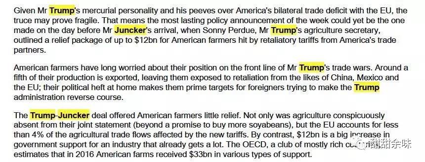 2.從英國(guó)媒體的報(bào)道切入點(diǎn)來(lái)看,英國(guó)作為歐洲國(guó)家的重要代表(雖然英國(guó)已經(jīng)發(fā)布了脫歐白皮書(shū),但是在歐盟的官網(wǎng)上,歐盟的28個(gè)國(guó)家里,目前仍然是包括了United Kingdom的),對(duì)美國(guó)對(duì)外咋咋呼呼給各國(guó)添亂、實(shí)際上不動(dòng)聲色自有打算的做法并不感冒。管中窺豹,或可判斷容克代表歐盟剛剛表過(guò)的態(tài)的不確定性將進(jìn)一步上升,除了德國(guó)、法國(guó)之外,英國(guó)也不可能真的跟美國(guó)好到一個(gè)鼻孔出氣。更不要說(shuō)在歐盟內(nèi)部農(nóng)業(yè)出口占大頭的其他國(guó)家。