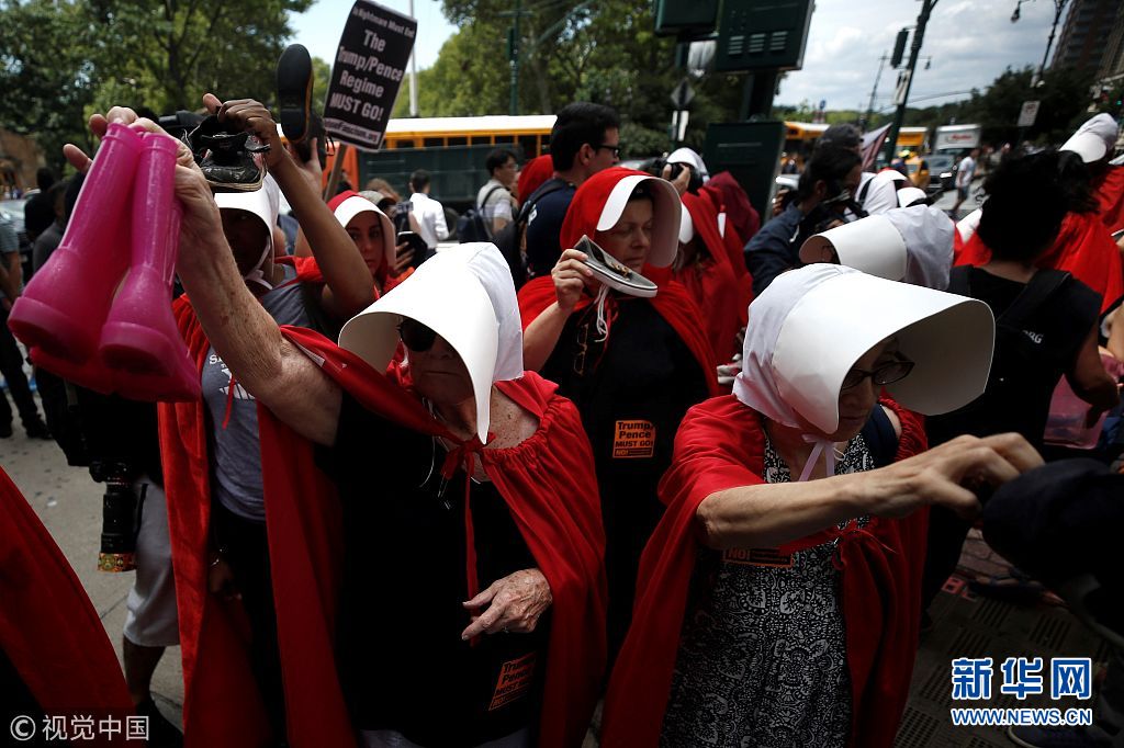 當?shù)貢r間2018年7月31日,美國紐約,女性示威者扮成美劇《使女的故事》中的“使女”在亞歷山大·漢密爾頓海關(guān)大樓前示威,抗議美國總統(tǒng)特朗普和副總統(tǒng)麥克·彭斯。她們手持鞋子,代表被迫與父母分離的移民兒童。(圖片來源:視覺中國)