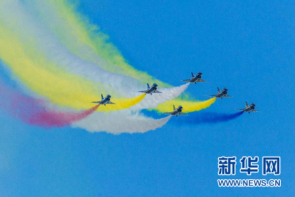 蔚藍(lán)的天空下,八一飛行表演隊(duì)成功上演了六機(jī)向下開花、五機(jī)水平向上開花、四機(jī)編隊(duì)橫滾、單機(jī)蛇行扭轉(zhuǎn)等21個(gè)高難度飛行動(dòng)作,贏得了現(xiàn)場(chǎng)觀眾陣陣掌聲。