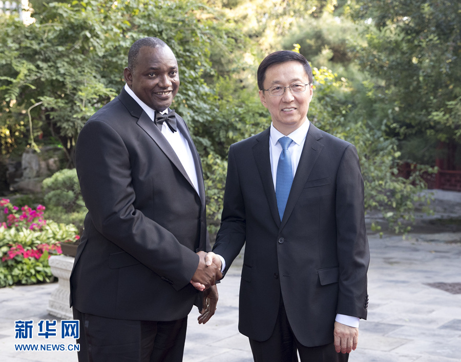 9月6日,中共中央政治局常委、國務(wù)院副總理韓正在北京釣魚臺國賓館會見岡比亞總統(tǒng)巴羅。 新華社記者 王曄 攝