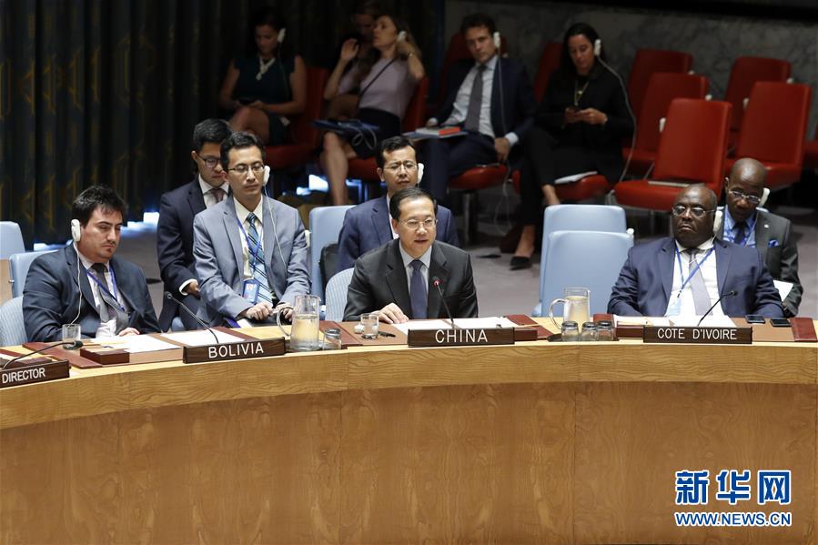 9月6日,在位于紐約的聯(lián)合國(guó)總部,中國(guó)常駐聯(lián)合國(guó)代表馬朝旭(前中)在安理會(huì)敘利亞化武問題公開會(huì)上發(fā)表講話。新華社記者李木子 攝