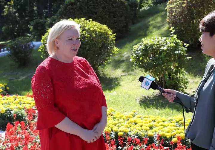勘察加邊疆區(qū)旅游和對(duì)外聯(lián)絡(luò)局局長(zhǎng)葉連娜·斯特拉托諾娃接受新華社記者采訪(新華社記者李建敏攝)