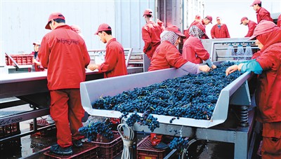 圖為摩洛哥一家酒莊的工人對葡萄進(jìn)行清洗加工準(zhǔn)備釀酒。葡萄酒將借首屆國際進(jìn)博會(huì)來到中國。新華社記者 陳斌杰攝