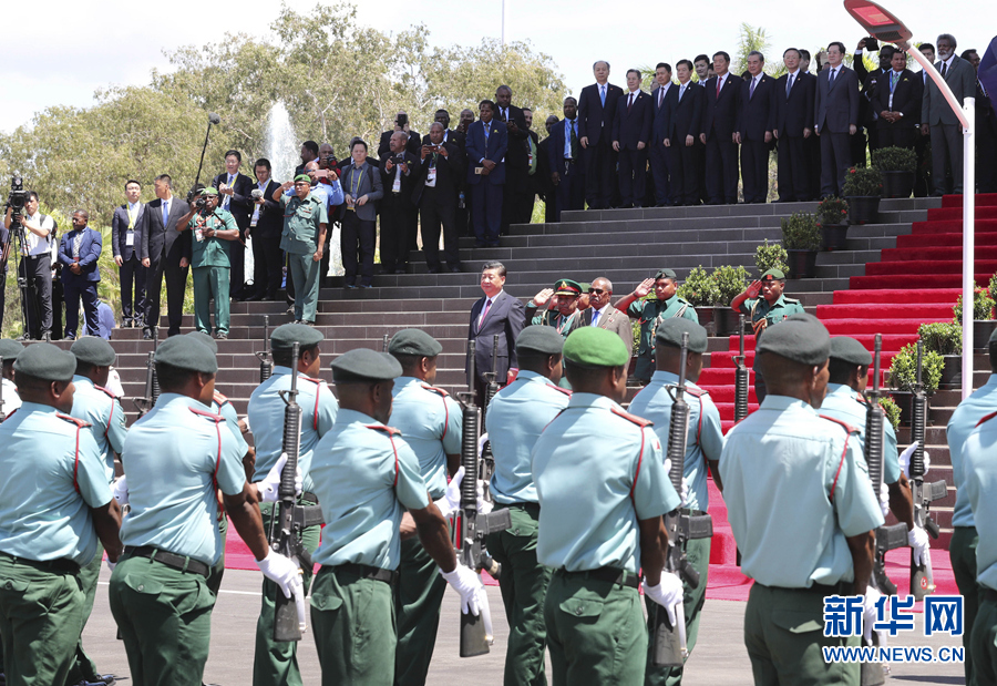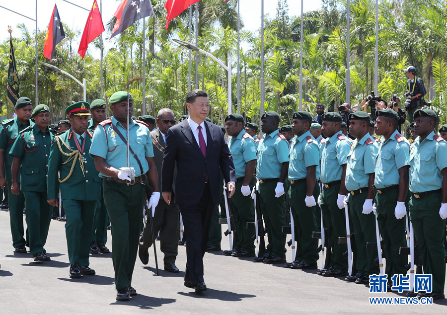 11月16日,國(guó)家主席習(xí)近平在莫爾茲比港會(huì)見巴布亞新幾內(nèi)亞總督達(dá)達(dá)埃。會(huì)見開始前,達(dá)達(dá)埃在議會(huì)大廈前廣場(chǎng)為習(xí)近平舉行隆重歡迎儀式。新華社記者 費(fèi)茂華 攝