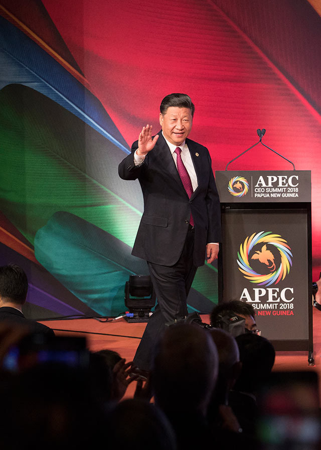 11月17日,國(guó)家主席習(xí)近平應(yīng)邀出席在巴布亞新幾內(nèi)亞莫爾茲比港舉行的亞太經(jīng)合組織工商領(lǐng)導(dǎo)人峰會(huì)并發(fā)表題為《同舟共濟(jì)創(chuàng)造美好未來(lái)》的主旨演講。這是習(xí)近平步入會(huì)場(chǎng)。新華社記者 黃敬文 攝