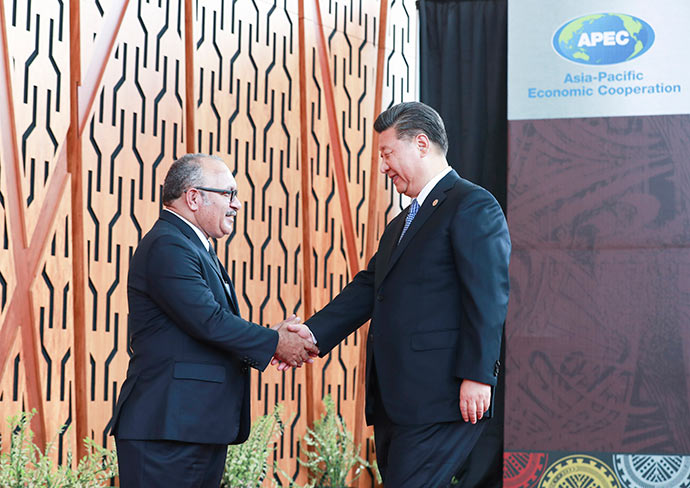 11月17日,國(guó)家主席習(xí)近平應(yīng)邀出席在巴布亞新幾內(nèi)亞莫爾茲比港舉行的亞太經(jīng)合組織工商領(lǐng)導(dǎo)人峰會(huì)并發(fā)表題為《同舟共濟(jì)創(chuàng)造美好未來(lái)》的主旨演講。同日,習(xí)近平還出席了亞太經(jīng)合組織領(lǐng)導(dǎo)人同工商咨詢理事會(huì)代表對(duì)話會(huì),受到巴布亞新幾內(nèi)亞總理奧尼爾的熱情迎接。新華社記者 龐興雷 攝