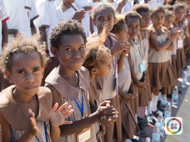 2018年11月13日,巴布亞新幾內(nèi)亞首都莫爾茲比港。孩子們?yōu)闅g迎出席中國(guó)-巴新友誼學(xué)?!げ紙D卡學(xué)園啟用儀式的習(xí)近平主席精心排練歌曲《茉莉花》。(新華社記者費(fèi)茂華攝)