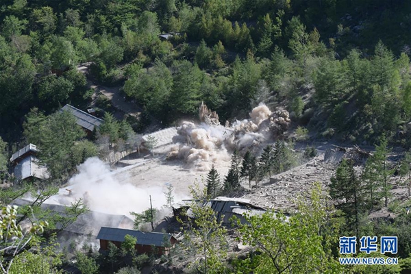 這是5月24日在朝鮮咸鏡北道吉州郡的豐溪里核試驗(yàn)場拍攝的場內(nèi)地面建筑爆破場景。朝鮮24日在豐溪里核試驗(yàn)場對(duì)多條坑道和附屬設(shè)施進(jìn)行爆破,并宣布正式廢棄這座核試驗(yàn)場。 新華社記者 程大雨 攝