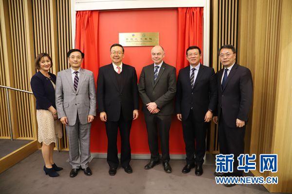 2月26日,在愛爾蘭首都都柏林,中國(guó)教育部副部長(zhǎng)田學(xué)軍(左三)、中國(guó)駐愛爾蘭大使岳曉勇(左二)和都柏林大學(xué)校長(zhǎng)安德魯?迪克斯(右三)等在都柏林大學(xué)示范孔子學(xué)院揭牌儀式上合影。