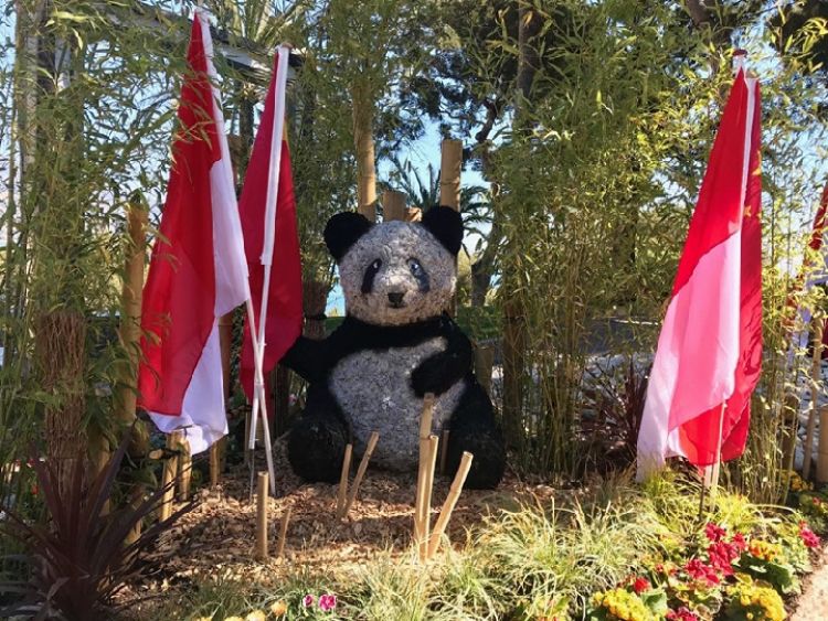 為迎接中國貴賓,摩納哥街心花園立起一個大熊貓雕塑。新華社記者趙丁喆攝