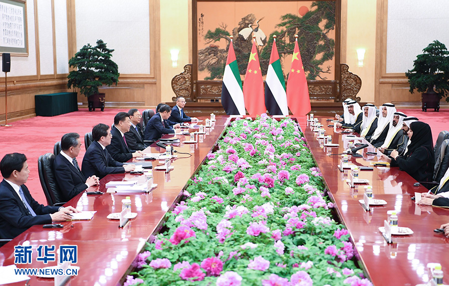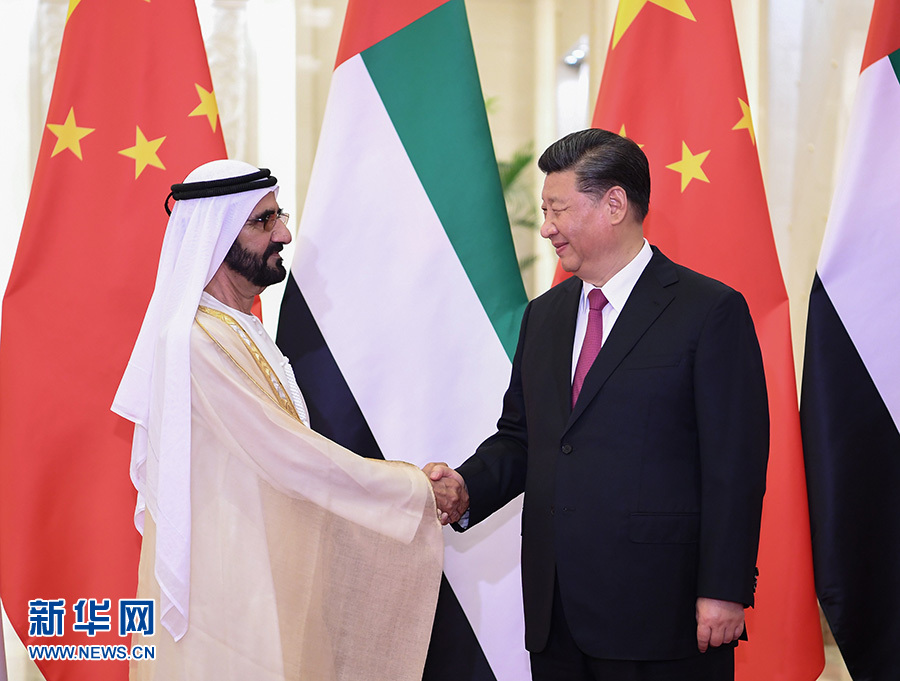 習近平指出,去年7月我訪問阿聯(lián)酋期間,兩國宣布建立全面戰(zhàn)略伙伴關系,揭開中阿關系發(fā)展新篇章。中方視阿聯(lián)酋為共建“一帶一路”的重要合作伙伴。雙方要穩(wěn)步推進以能源合作為主軸、以投資和基礎設施建設為兩翼、以高新技術為增長點的務實合作。下階段要對接創(chuàng)新發(fā)展戰(zhàn)略,打造兩國合作新增長點。要深化打擊恐怖主義和極端勢力等安全領域合作,共同維護兩國和地區(qū)安全穩(wěn)定。副總統(tǒng)先生提出的“擁抱中國”計劃深受阿聯(lián)酋民眾歡迎,要不懈推動兩國人文交流。中方支持阿方明年舉辦中東地區(qū)首屆世博會。