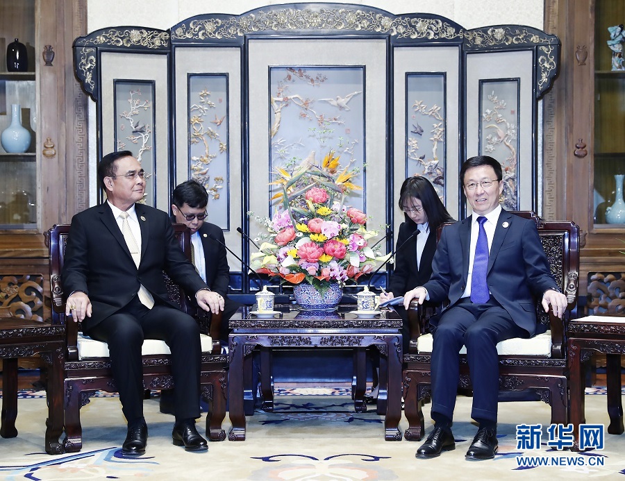 4月26日,中共中央政治局常委、國務(wù)院副總理韓正在北京釣魚臺國賓館會見泰國總理巴育。新華社記者 劉彬 攝