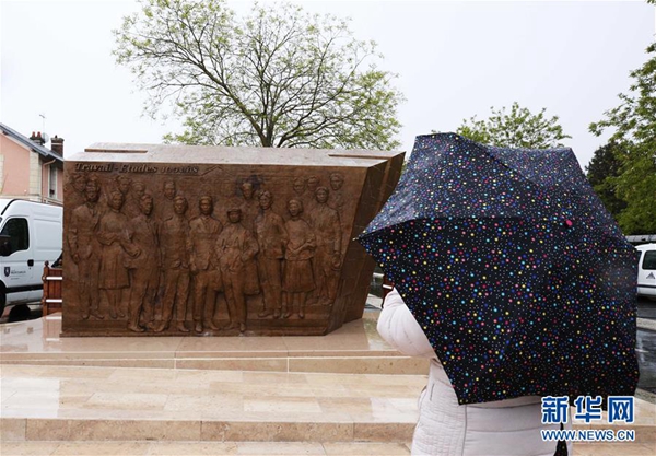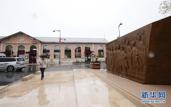 5月4日,在距法國(guó)巴黎100多公里的小城蒙塔日,《百年豐碑》大型雕塑被安放在火車站前的鄧小平廣場(chǎng)。新華社記者 高靜 攝