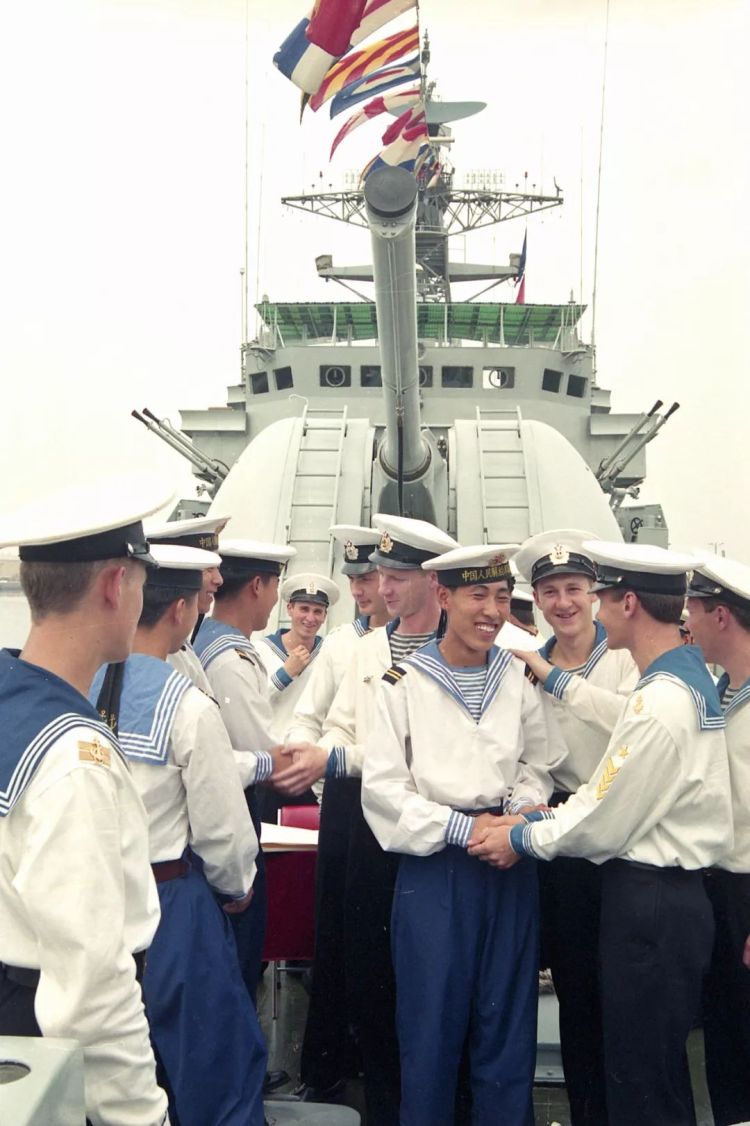 ↑正在山東青島進(jìn)行友好訪問(wèn)的俄羅斯海軍太平洋艦隊(duì)官兵,來(lái)到中國(guó)海軍艦艇參觀,受到中國(guó)水兵的熱情歡迎。(1993年8月26日,新華社稿)