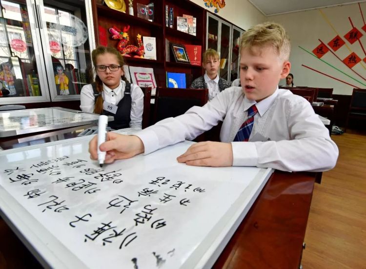↑俄羅斯學(xué)生在符拉迪沃斯托克遠(yuǎn)東聯(lián)邦大學(xué)孔子學(xué)院書(shū)寫漢字。(2017年,尤里·斯米秋克)