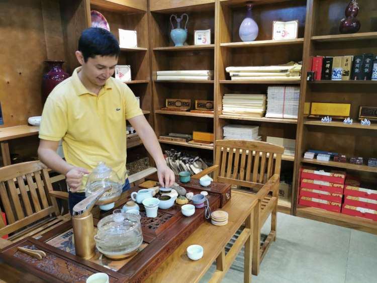 阿肯木還秀起了自己的功夫茶技,動作有板有眼。(新華社記者 王申 攝)