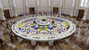 15日上午,杜尚別納烏魯茲宮,習主席出席亞洲相互協(xié)作與信任措施會議第五次峰會。圓桌會議開始后,亞信主席國元首拉赫蒙總統(tǒng)邀請習主席第一個發(fā)言。