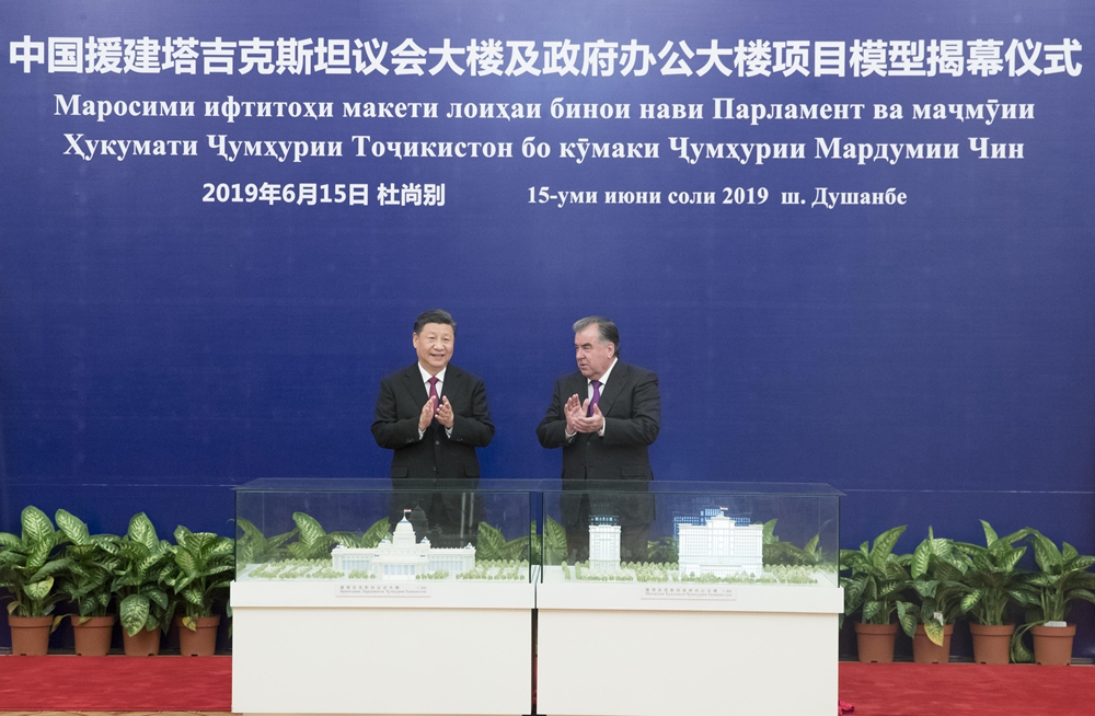 6月15日,國家主席習近平在杜尚別同塔吉克斯坦總統(tǒng)拉赫蒙會談。會談后,兩國元首共同出席中方援塔議會大樓、政府辦公大樓項目模型揭幕儀式。新華社記者 王曄 攝
