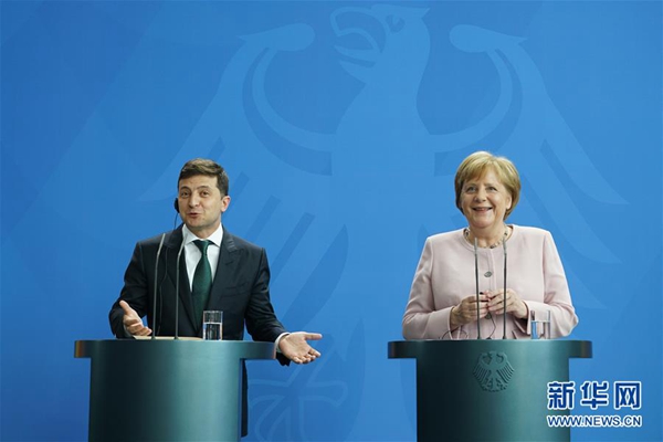 6月18日,在德國(guó)柏林,德國(guó)總理默克爾(右)與到訪的烏克蘭總統(tǒng)澤連斯基共同出席聯(lián)合記者會(huì)。新華社記者 王勍 攝
