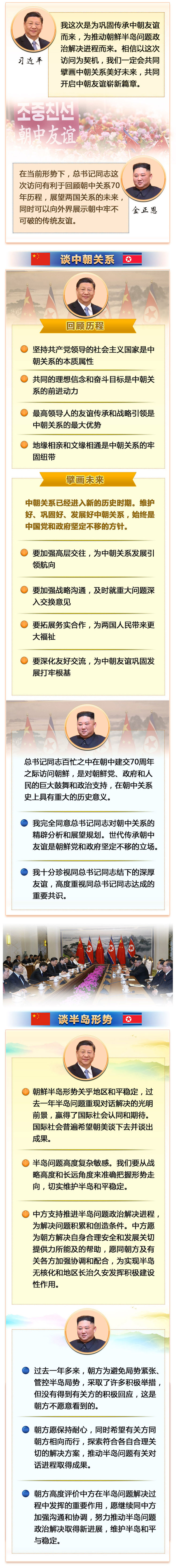 金正恩說,我代表朝鮮黨、政府和人民,熱烈歡迎習(xí)近平總書記對(duì)朝鮮進(jìn)行國(guó)事訪問??倳浲景倜χ性诔薪ń?0周年之際訪問朝鮮,是對(duì)朝鮮黨、政府和人民的巨大鼓舞和政治支持,在朝中關(guān)系史上具有重大的歷史意義。今天平壤有25萬多民眾涌上街頭,熱烈歡迎總書記同志。在當(dāng)前形勢(shì)下,總書記同志這次訪問有利于回顧朝中關(guān)系70年歷程,展望兩國(guó)關(guān)系的未來,同時(shí)可以向外界展示朝中牢不可破的傳統(tǒng)友誼。我完全同意總書記同志對(duì)朝中關(guān)系的精辟分析和展望規(guī)劃。世代傳承朝中友誼是朝鮮黨和政府堅(jiān)定不移的立場(chǎng)。我十分珍視同總書記同志結(jié)下的深厚友誼,高度重視同總書記同志達(dá)成的重要共識(shí),愿以總書記同志這次訪朝為契機(jī),推動(dòng)朝中雙方進(jìn)一步加強(qiáng)戰(zhàn)略溝通,深化各領(lǐng)域友好交往,把朝中關(guān)系不斷提升至新的高度。