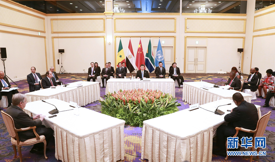 6月28日,國家主席習(xí)近平在大阪主持中非領(lǐng)導(dǎo)人會晤。中非合作論壇前任非方共同主席國南非總統(tǒng)拉馬福薩、非洲聯(lián)盟輪值主席國埃及總統(tǒng)塞西、中非合作論壇現(xiàn)任非方共同主席國塞內(nèi)加爾總統(tǒng)薩勒和聯(lián)合國秘書長古特雷斯出席。新華社記者 龐興雷 攝